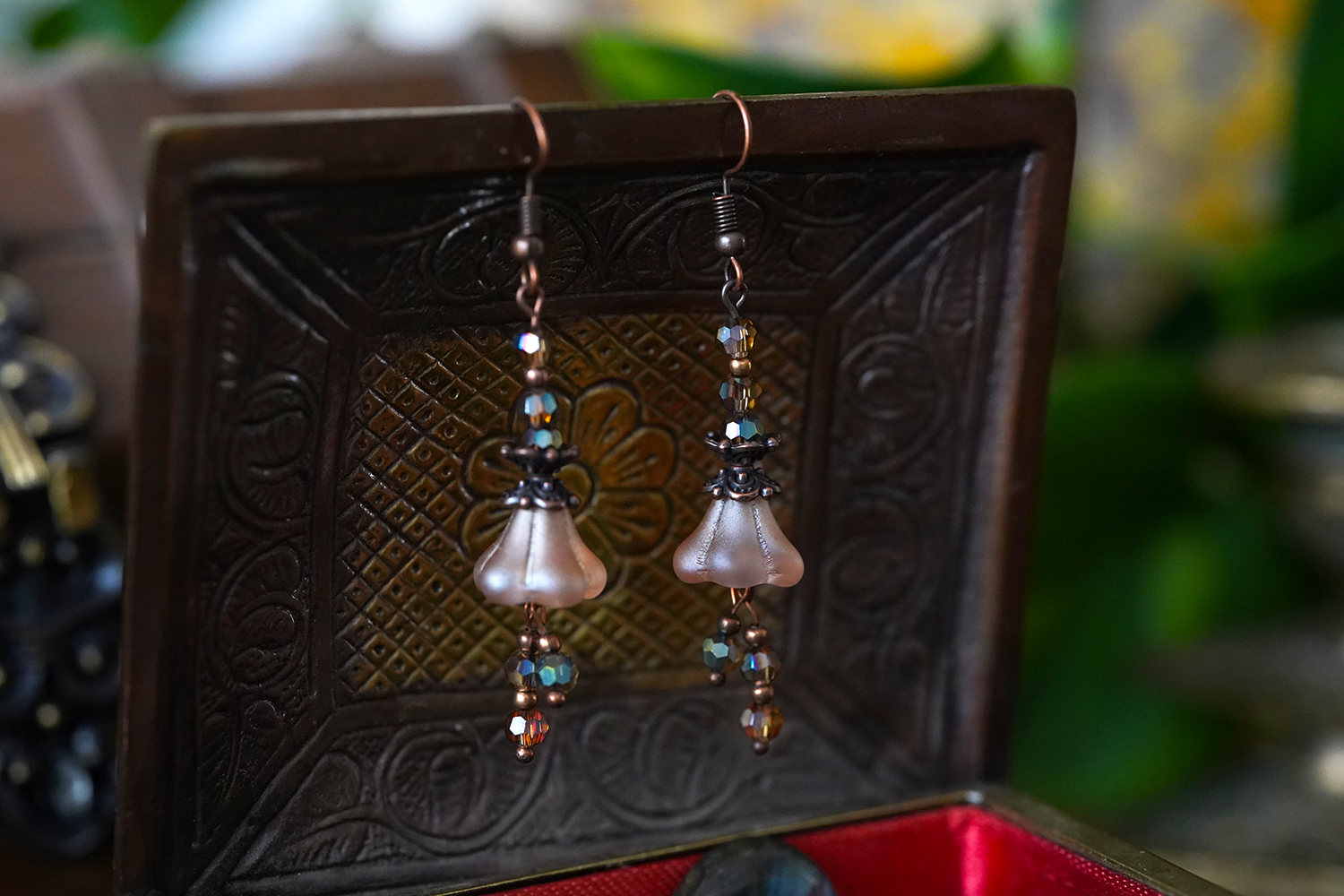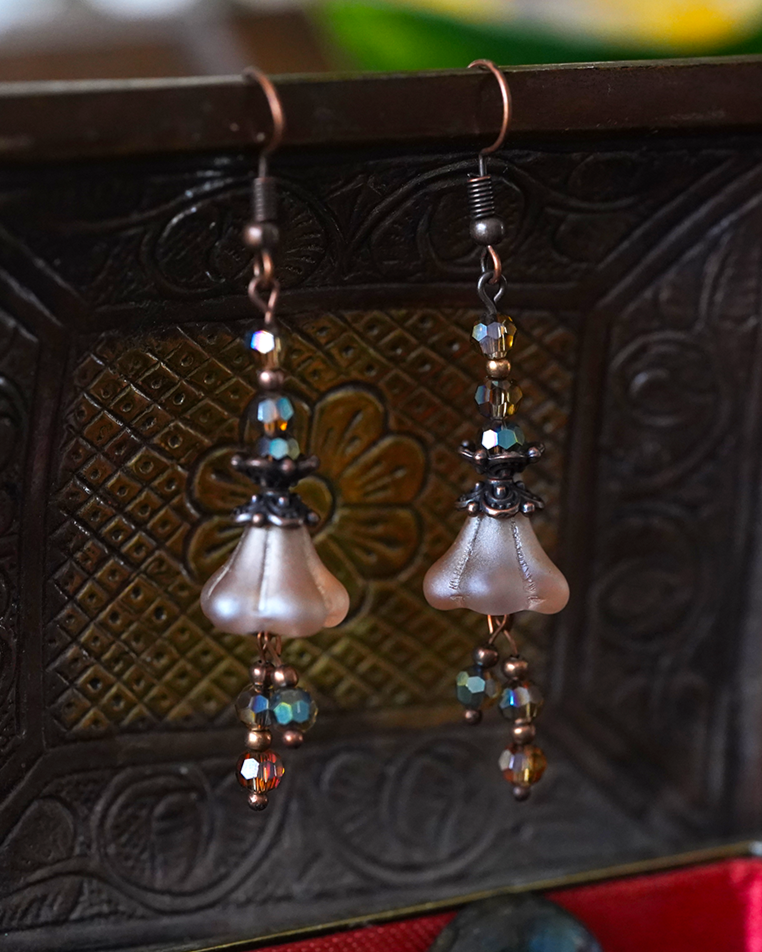 Aan koperen en bronzen onderdelen hangen gepolijste bloemenkralen, gecombineerd met gefacetteerde accenten. Daarmee vormen ze een opvallend accessoire voor zwervers, alchemisten en liefhebbers van alles wat betoverend is.