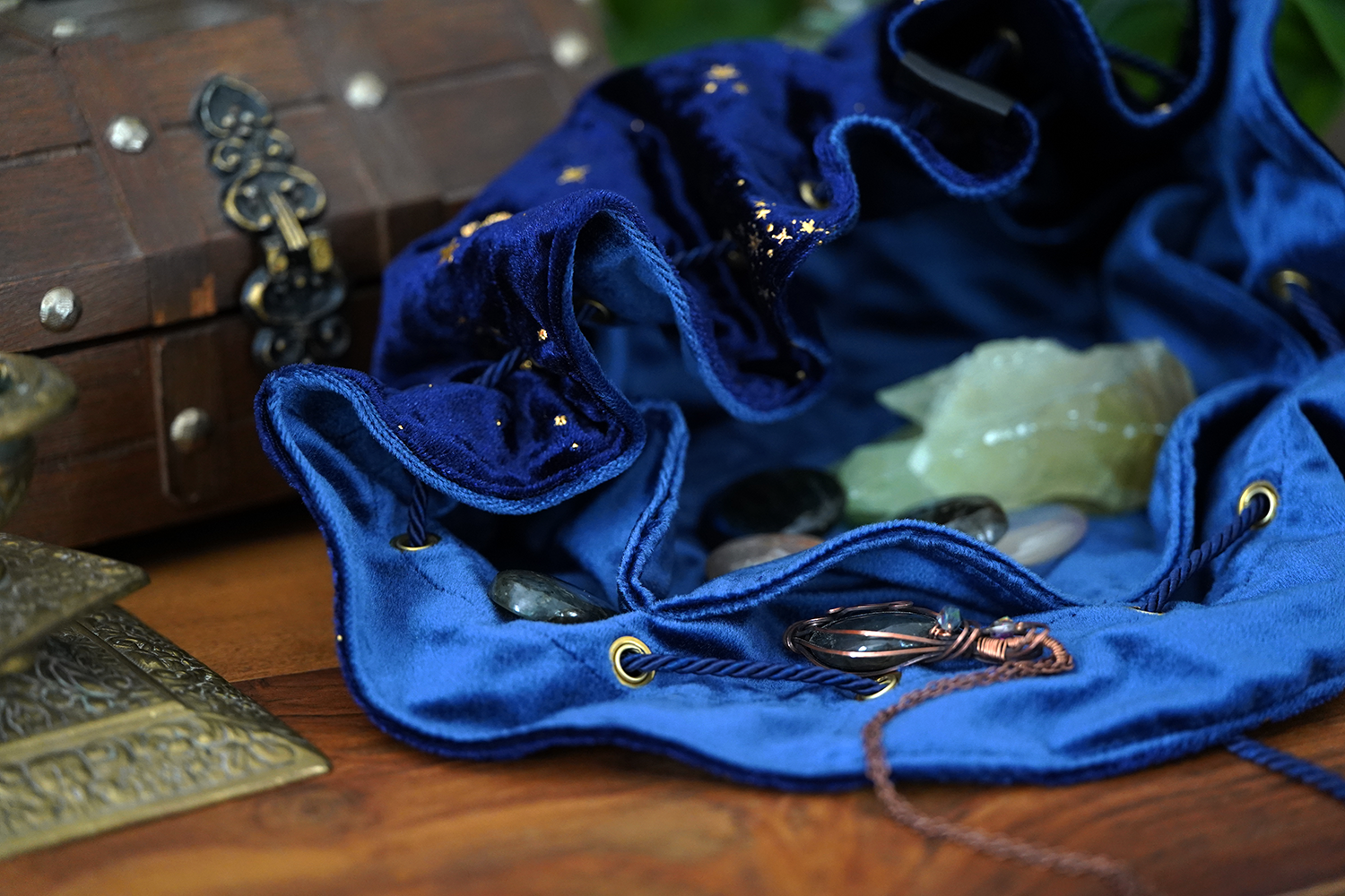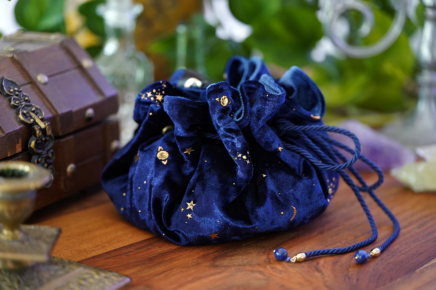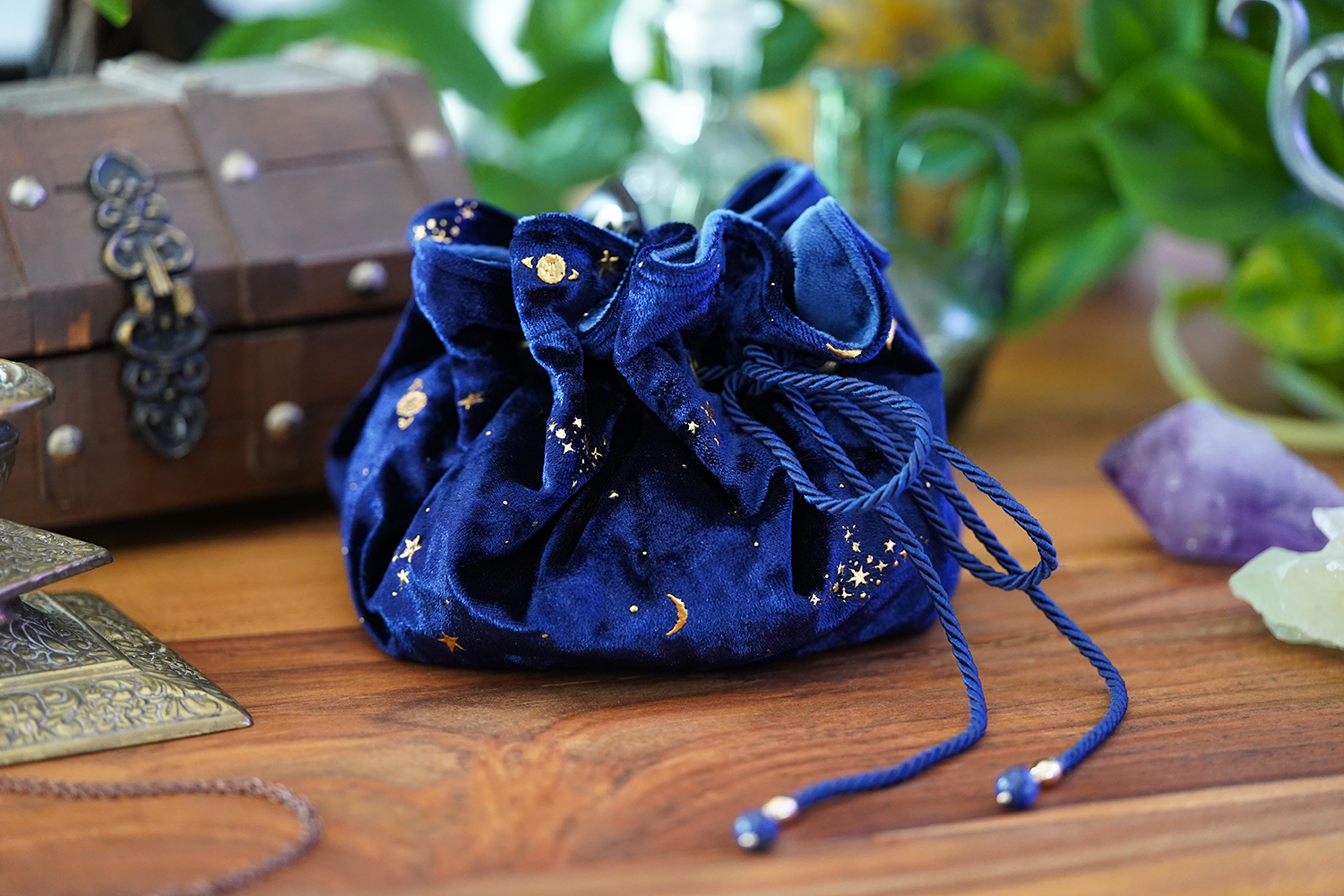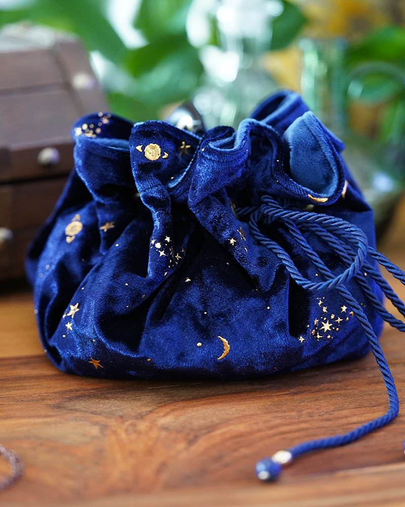 Dit op de kosmos geïnspireerde fluwelen buideltje is geweven uit de nachtelijke hemel zelf en is de perfecte bewaarplaats voor uw door sterren gesmede schatten - of het nu dobbelstenen, souvenirs of betoverde curiosa zijn.